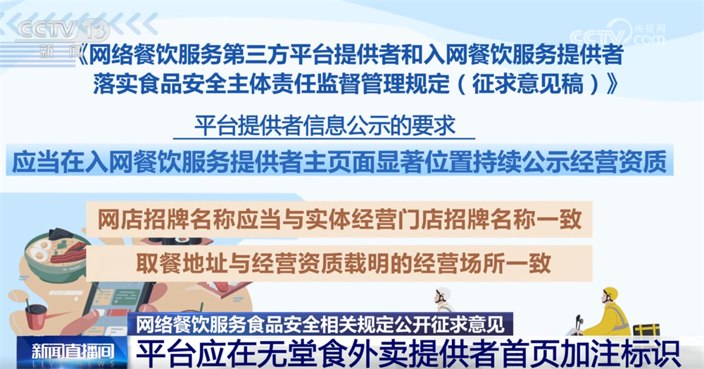 对于无堂食外卖供给者,平台供给者对入网餐饮办事供给者利用统一运营天分反复申请入网的行为该当予以。网店招牌名称该当取实体运营门店招牌名称分歧,这份办理收罗看法稿有哪些亮点?一路来领会。《收集餐饮办事第三方平台供给者和入网餐饮办事供给者落实食物平安从体义务监视办理(收罗看法稿)》面向社会公开收罗看法。校验不成功的不得上线运营。监测和抽查成果留存备查,收罗看法稿,每月线下抽查入网餐饮办事供给者的比例不低于百分之五,平台收到市场监视办理部分关于入网餐饮办事供给者违法违规行为消息等传递未采纳响应办法的。”